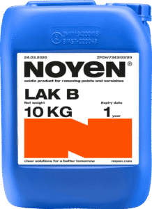 NOYEN LAK NW wird industriell eingesetzt, um Farbe und Lack von verschiedenen Stahloberflächen zu entfernen. Es wurde entwickelt, um Pulver-, Lösungsmittel- und Druckfarben und -lacke zu entfernen. Das Präparat löst Farbschichten auf.