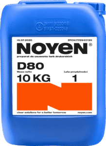 NOYEN D80 jest słabo kwaśnym, wodnym preparatem przeznaczonym do mycia elementów i instalacji maszyn drukarskich oraz do usuwania pozostałości farb drukarskich.